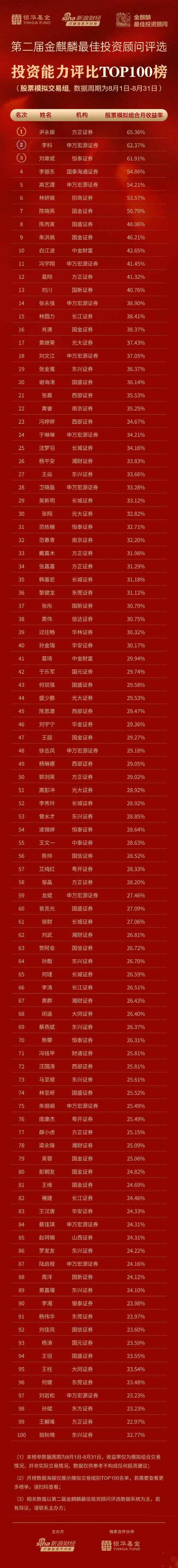 目前金麒麟最佳投资顾问评选火热进行中!股票模拟交易、场内ETF模拟交易、公募基金模拟配置、社交服务评比……万名投顾大PK,8月月榜数据(周期为8月1日-8月31日)显示,股票模拟组合评比中,方正证券投顾尹永振(来自延吉爱丹路证券营业部)以收益率65.36%居月榜榜首;