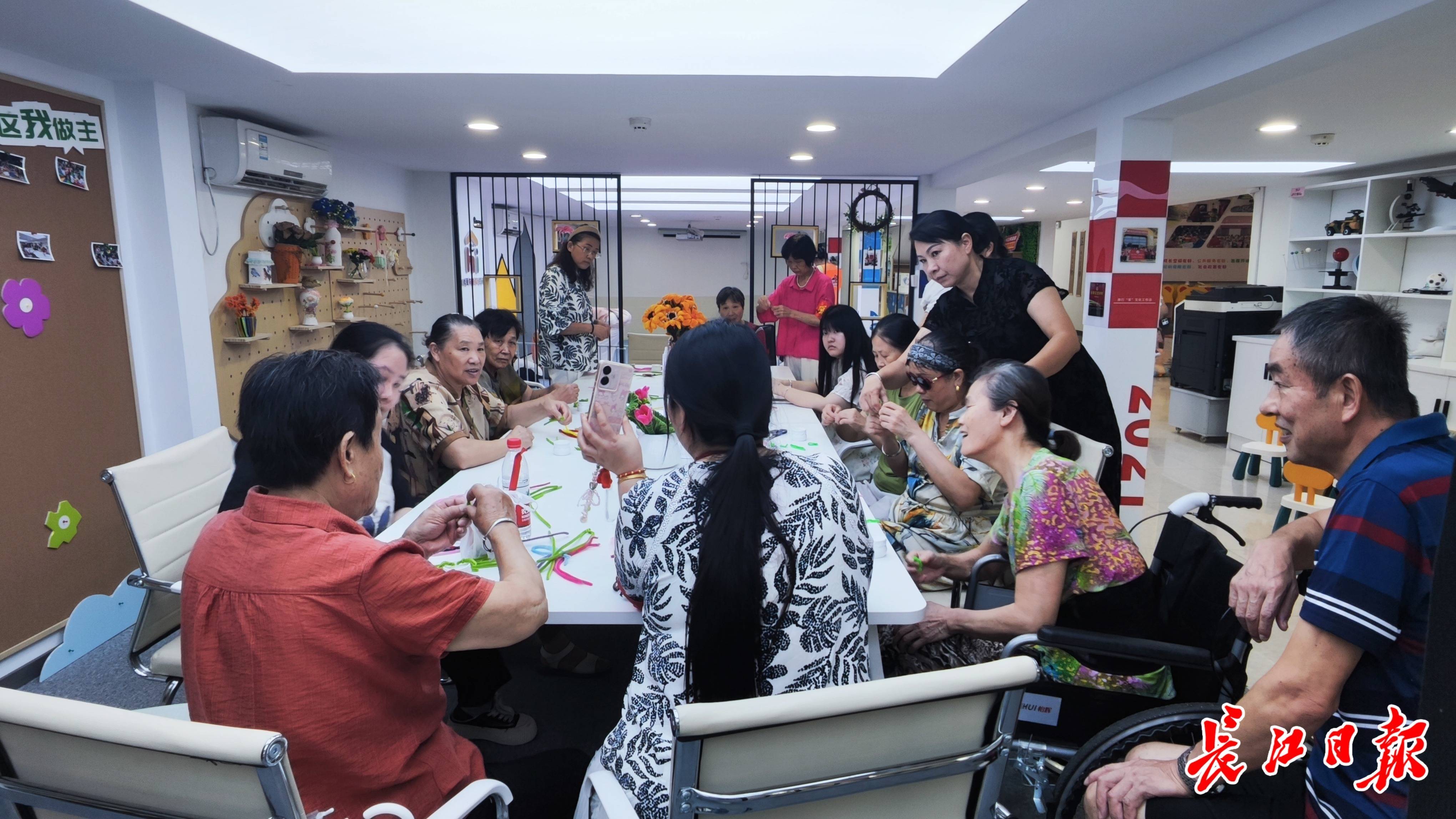 盛夏高温,走进江汉区北湖街道横堤社区党群服务中心,一片凉爽,更是一片热闹。年轻人带着笔记本电脑在社区大厅办公,年长的居民聚在一起做蛋糕、写书法、下象棋,年幼的孩子们则在社区志愿者的带领下玩游戏……