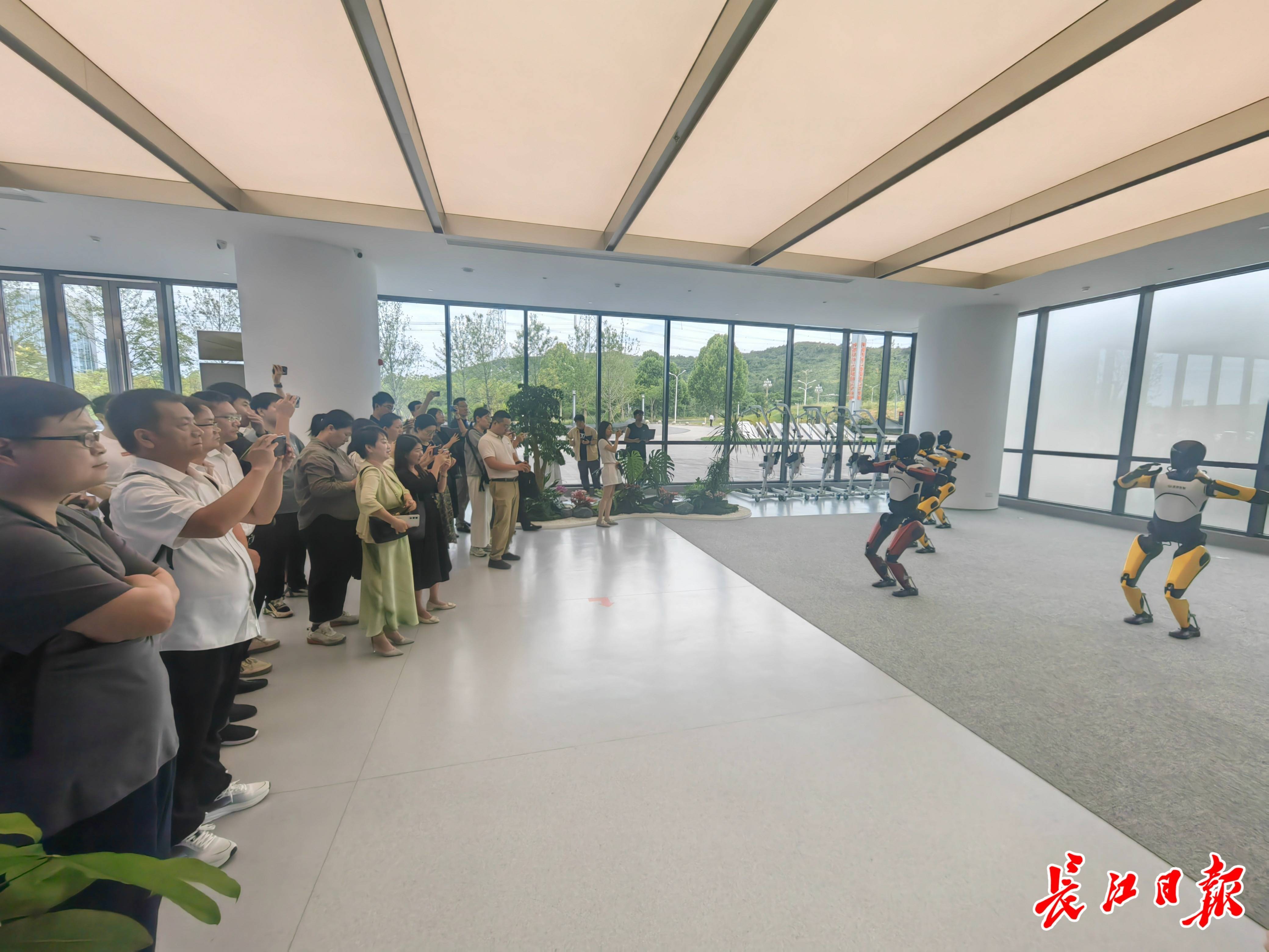 走进湖北人形机器人创新中心,刚一进大门,评议员们就感受到了扑面而来的科技感,整齐列队的6台人形机器人在大家身边翩然起舞。它们灵活地完成高抬腿、举手等动作,步伐协调,机器人群舞表演引得现场惊叹连连。